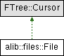This class represents nodes in FTree instances. While class FTree is just a rather small wrapper around its base class StringTree, this class File is a wrapper around class Cursor. With that, instances of this class are very lightweight and contain only two pointers: One pointing to the FTree that an instance originates from, the second pointing to the node in the tree.