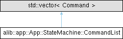 A list of pairs of states and corresponding methods to process. This struct is used only once, namely with the field StateMachine::Program. The constructor of class App fills this list with all commands defined in the enumeration States. While the insertion methods AddBefore and AddAfter are provided for convenience, more complex manipulation of the list is allowed using the interface inherited from std::vector.
